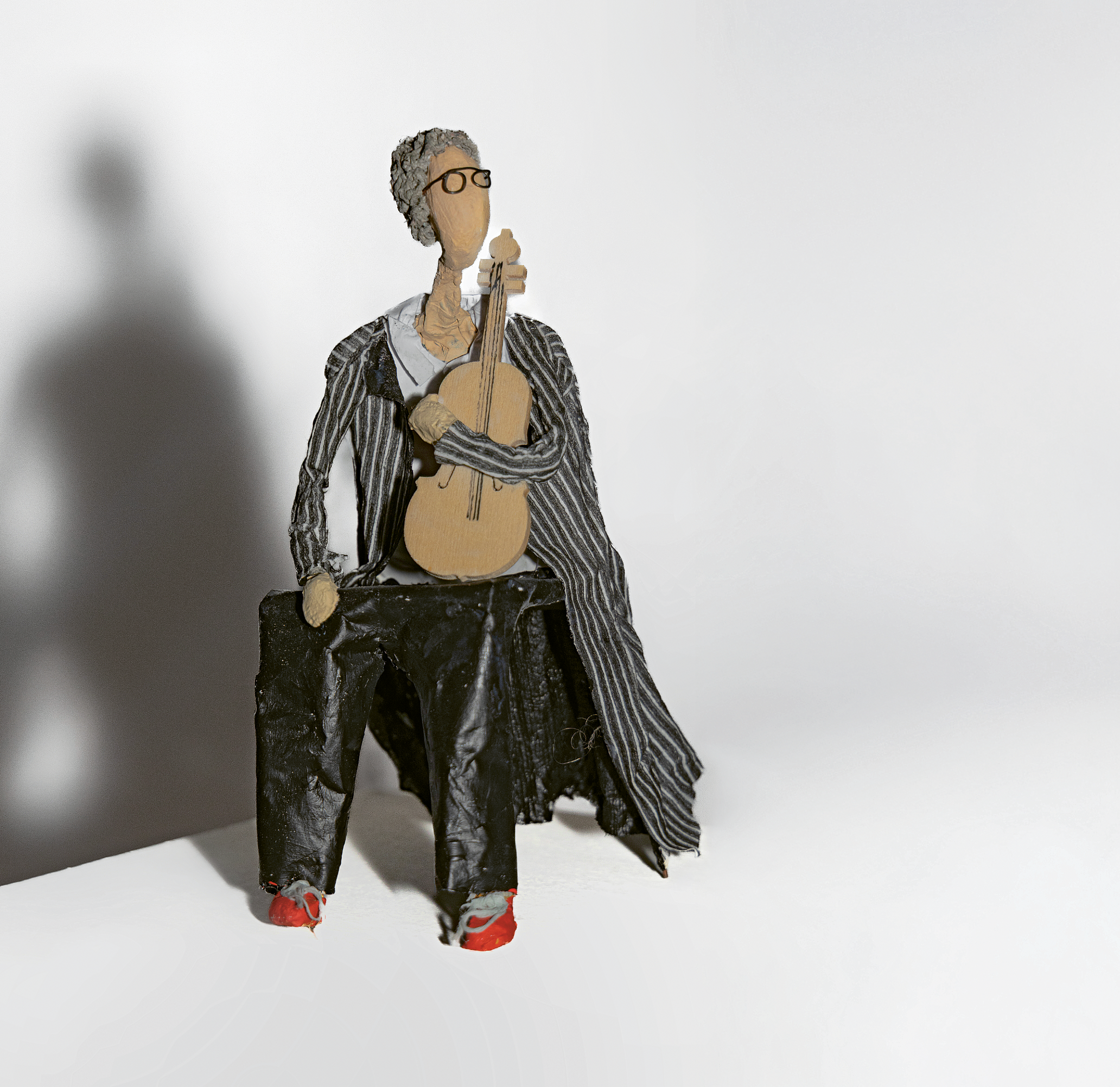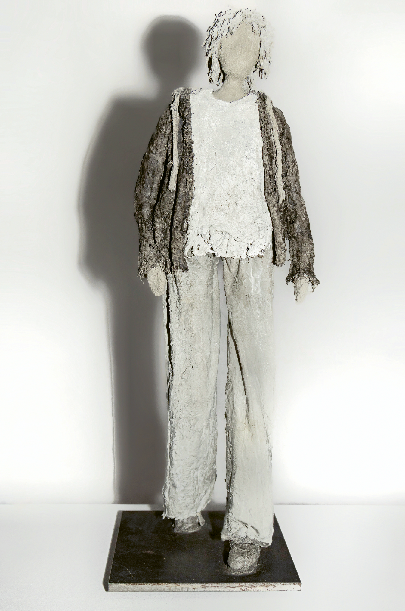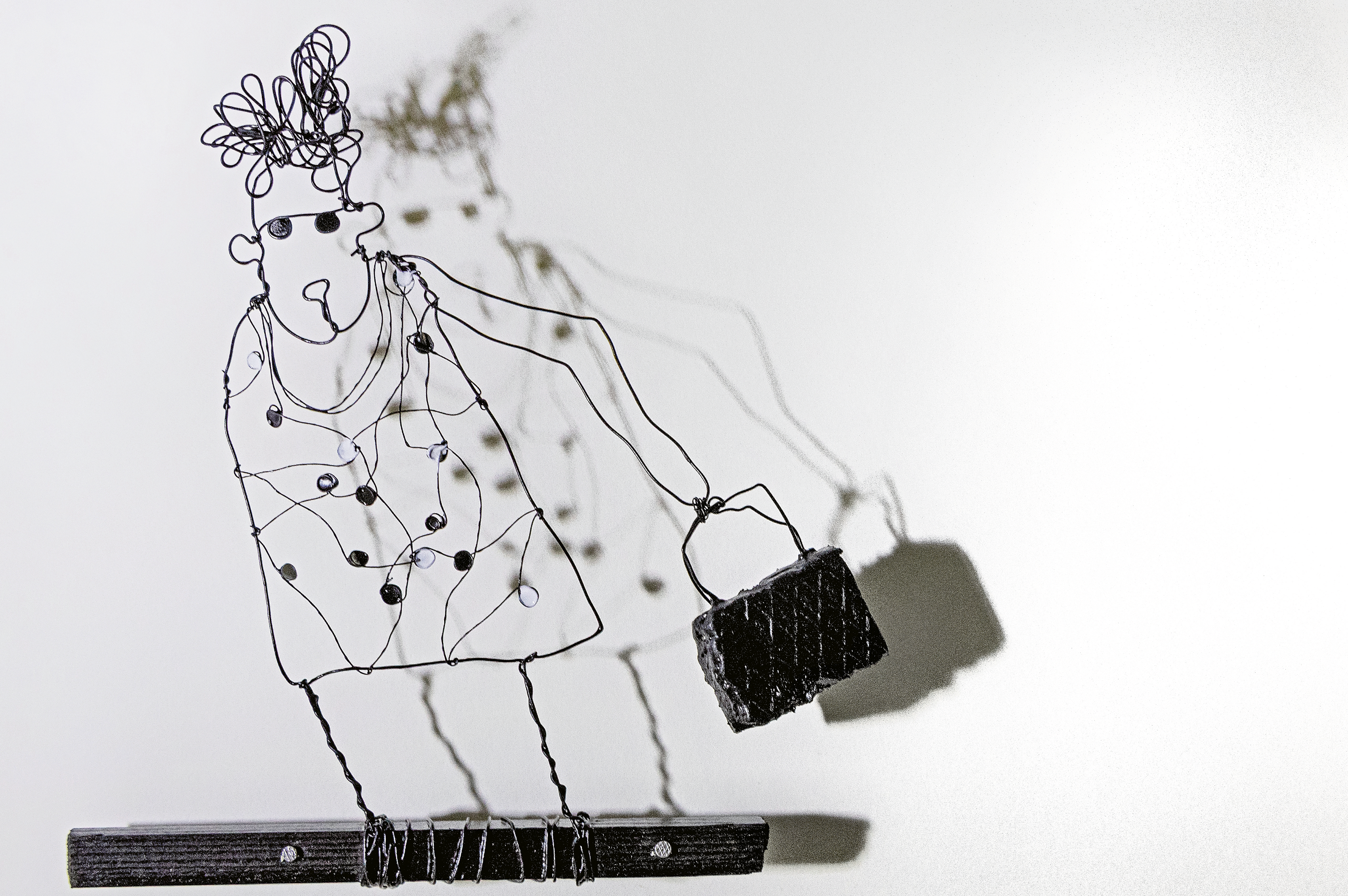 Zement verlangt Geduld – etwas, das sie sonst nicht in Unmengen hat. Schicht für Schicht gibt sie Haltung, Ausdruck, Stabilität. Rau, grau oder schwarz, kontrastiert mit Weiss und oft einem roten Akzent. Daneben entstehen Drahtgesichter, die mit Schatten spielen, oder humorvolle, bunte Papierfiguren. Immer wieder spricht sie beim Arbeiten mit ihren Werken.