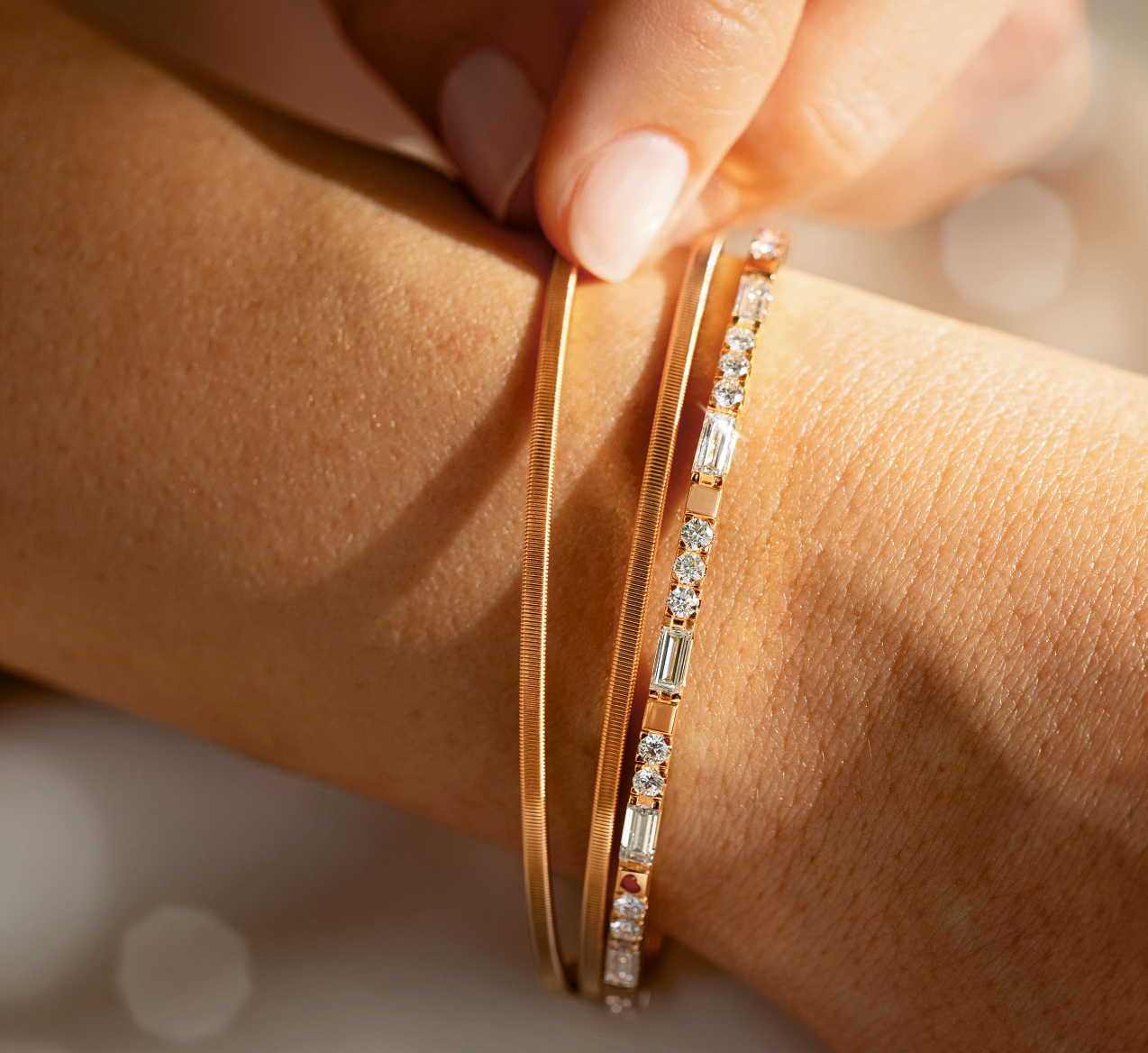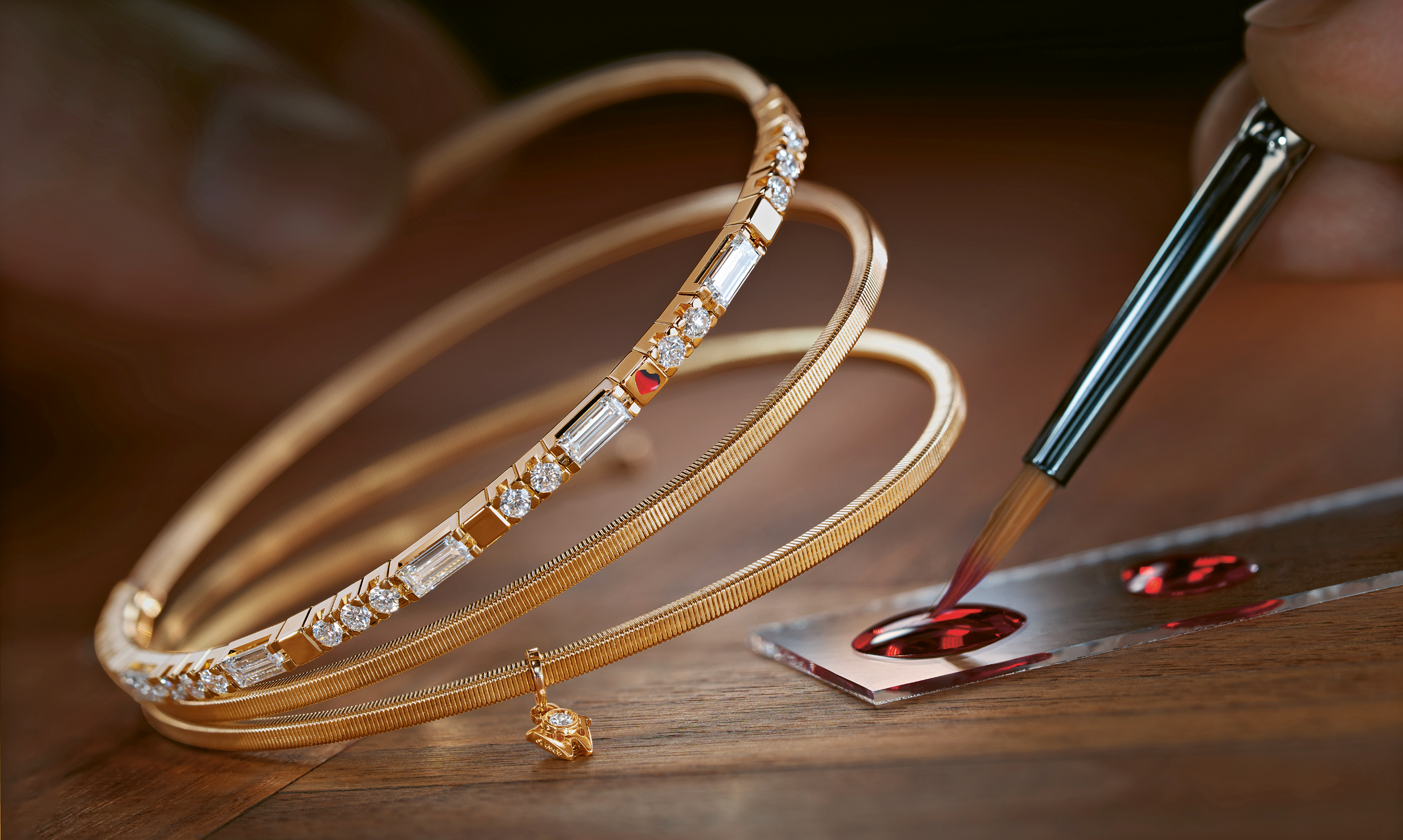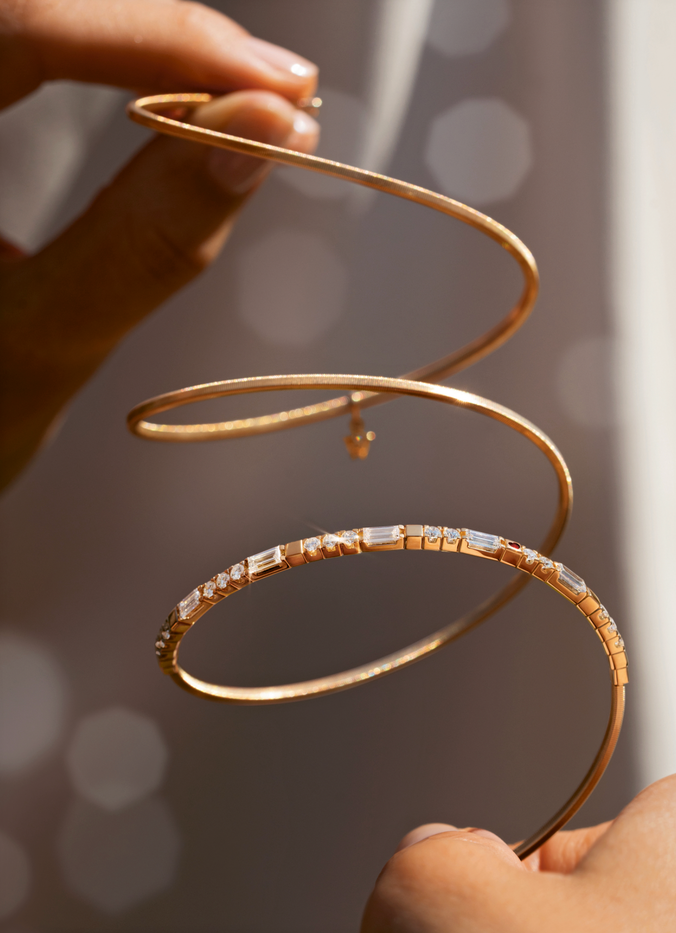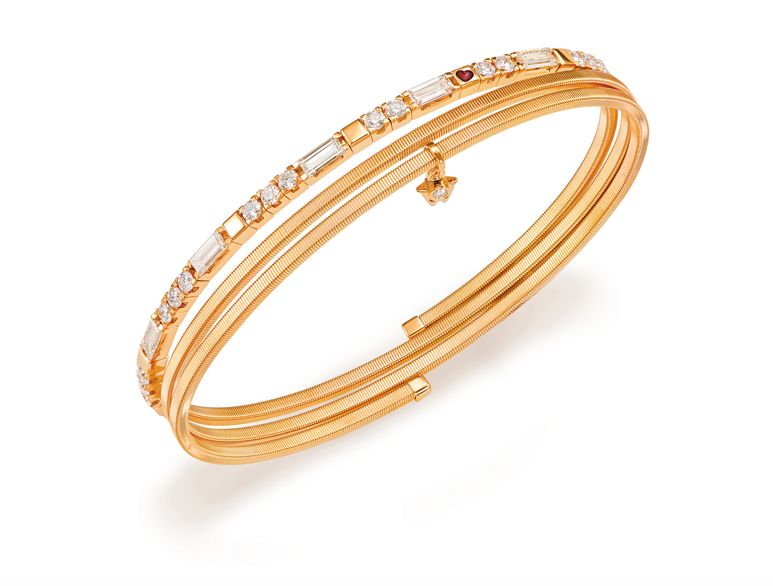 For a harmonious overall appearance, all diamonds must also be identical. Wellendorff is very critical in their selection: only one in 10 000 baguette incorporated diamonds meets the strict requirements for further manufacturing into a shining embrace.
